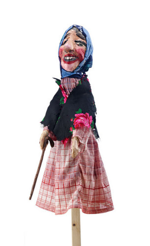 Rappresentazione del personaggio della Strega maledetta, moglie di Arlecchino. I tratti caratterizzanti della donna anziana e sgradevole sono i grossi denti ben in vista, il naso sporgente, gli occhi tratteggiati con inclinazione allingiù, il fazzoletto sul capo e lo scialle sulle spalle. Il bastone agganciato alla mano destra diventa strumento per percuotere, vista la mobilità in senso verticale (alto e basso) del braccio. Il costume del burattino è composto da una veste di stoffa a quadretti, su cui poggia sulle spalle uno scialle nero di stoffa di lana stampata con rose. La testa è coperta da un foulard a fantasie azzurre chiuso stretto sul collo.Notizie storico-critiche