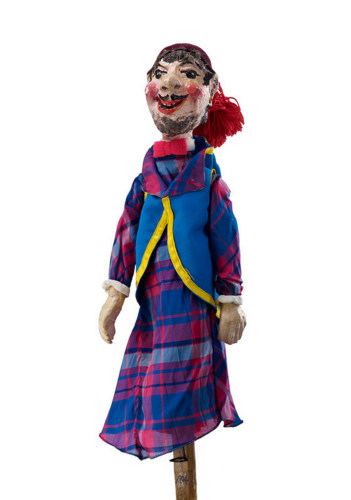 Rappresentazione di Fagiolino da Bologna, personaggio giocoso, bonario e pronto alla rissa per far vincere la giustizia. Il grande sorriso e le gote rubiconde danno espressività al burattino connotato anche da un berretto rosso con fiocco. La particolarità del volto consiste nella barba e capelli realizzati con capelli o peli umani, presumibilmente delle stesso Pastrello. Il costume è composto da una veste di tela lucida a scacchi con colletto e polsi bianchi, e da una casacca di tinta unita azzurra, bordata con passamaneria gialla. Completa la caratterizzazione del personaggio in senso positivo e leggero la cravatta a farfalla rosa.Notizie storico-critiche