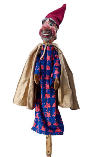 Rappresentazione del personaggio dello Stregone maledetto caratterizzato da un volto quasi caricaturale con un grosso naso, un sorriso con denti ben in vista molto vicino a un ghigno e un cappello rosso a punta. Tracce di grigio sulla barba e sulle sopraciglia definiscono letà avanzata del personaggio. Il costume è composto da una veste colorata e un mantello a tinta unita fermato con un nastrino al collo.Notizie storico-critiche