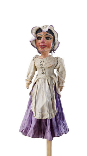 Rappresentazione di Colombina, maschera veneziana della commedia dellarte caratterizzata da un aspetto giovane, furbo e piacente. Gli occhi mobili in senso orizzontale e il grande sorriso connotano in maniera positiva laspetto del volto, aumentandone inoltre lespressività. Il costume molto articolato è composto da un vestito con corpetto bianco arricciato in vita e profilato di pizzo ai polsi e al collo, unito a una gonna viola con balze e un grembiule bianco che ritorna con un coprigonna anche nella parte posteriore. La cuffia bianca è profilata con una passamaneria dello stesso colore della gonna. Probabilmente le braccia erano animate, ma l'intervento di restauro ha rimosso il bastone di supporto e quindi il meccanismo di tiro con i filiNotizie storico-critiche