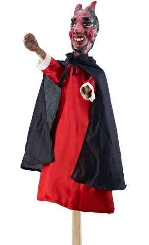 rappresentazione del personaggio del Diavolo, Belzebù caratterizzato dalle corna e il vestito rosso. L'aspetto volutamente orrifico è ottenuto in particolare grazie alla colorazione di rosso e nero del volto e ai denti ben visibili dipinti allinterno della grande bocca. La barba e le grosse sopra ciglia nere contribuiscono allespressività paurosa del volto. La veste è rifinita da dei polsi bianchi e un mantello nero legato con una fettuccia al colloNotizie storico-critiche