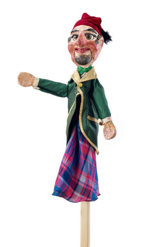 Rappresentazione di Sandrone maschera della Commedia dellArte italiana che mette in scena un contadino rozzo, affamato, e al contempo scaltro e simpatico. Gli occhi e la bocca mobili aumentano lespressività del burattino connotato anche da un berretto rosso con fiocco nero. Inoltre la barba e i capelli sono realizzati con capelli o peli umani, presumibilmente delle stesso Pastrello. Il costume è composto da una veste di tela lucida a scacchi (probabile sostituzione della originale danneggiata) coperta da una casacca di tinta unita bordata con stoffa chiara. Completa la caratterizzazione del personaggio in senso positivo e leggero la cravatta a farfalla.Notizie storico-critiche