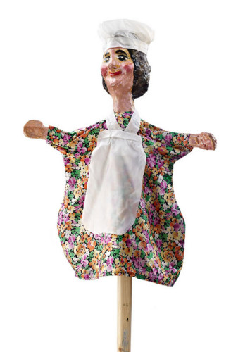 Rappresentazione di Colombina, maschera veneziana della commedia dellarte caratterizzata da un aspetto giovane, furbo e piacente. La bocca sorridente, i capelli corvini vaporosi dipinti direttamente sulla cartapesta e le gote rosse connotano in maniera positiva laspetto del volto. Il costume in questo caso accentua il ruolo di servetta del personaggio, con una veste a fiori sopra a cui è fissato un grembiule di tela bianca e un cappello da cuoco sempre di tela bianca.Notizie storico-critiche