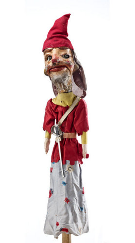 Il personaggio rappresentato è quello del Gendarme identificato dalla spada fissata alla cintura. Probabilmente il ruolo richiedeva grande articolazione, infatti il burattino ha sia le braccia che gli occhi e la bocca mobili. La particolarità del volto consiste nella barba realizzata con capelli o peli umani, presumibilmente delle stesso PastrelloNotizie storico-critiche