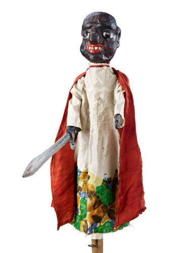 Rappresentazione del personaggio del Moro caratterizzato dalla pelle scura del volto. Laggressività è suggerita dai grossi denti ben visibili nella bocca aperta e dalla spada fissata alla mano del braccio destro animato con un movimento verticale dal basso allalto. Il costume è composto da una veste bianca con pieghe in lunghezza e abbassamento con una fantasia fiorata , completato da un mantello rosso fissato al collo con un nastrinoNotizie storico-critiche