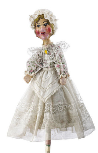 Rappresentazione di Colombina, maschera veneziana della commedia dellarte caratterizzata da un aspetto giovane, furbo e piacente. La bocca sorridente, i capelli biondi vaporosi dipinti direttamente sulla cartapesta e le gote rosse connotano in maniera positiva laspetto del volto. Mentre i colori chiari e labbondante pizzo definiscono piacevolmente il costume molto ricco e articolato. Questo è composto da una gonna e un grembiule a forma triangolare entrambi bianchi e con intarsi di pizzo sintetico. La camicetta a fiori ha i polsini bordati di pizzo, che ritorna anche nella cuffia bianca. Anche il collo arricciato è di pizzo bianco, con un piccolo fermaglio giallo.Notizie storico-critiche