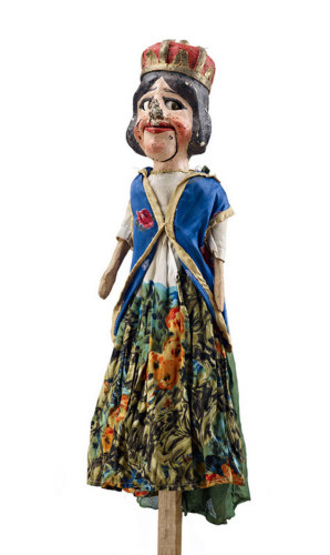 Rappresentazione della Principessa, personaggio con un ruolo generico a supporto di vari copioni. La caratterizzazione è data dalla corona e dal bordo del collo con un leggero filo di lustrini dorati. La bocca e gli occhi mobili orizzontalmente (da destra a sinistra) accentuano le possibilità espressive del volto. Il vestito è composto da una veste con pieghe e un gilet di stoffa diversa bordato di giallo.Notizie storico-critiche