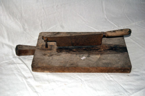 usato per tagliare il pane raffermo. La lama veniva usata come una leva ad un braccio - lalimento, appoggiato sul tagliere, viene tagliato sollevando e abbassando la lama, impugnandone il manico in legno