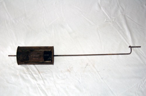 per tostare i chicchi di caffè e d'orzo - il serbatoio veniva riempito con i chicchi, l'attrezzo si attaccava alla catena del focolare o si appoggiava sulla linguetta sporgente dell'alare e si girava grazie all'impugnatura in modo da tostare completamente i chicchi.