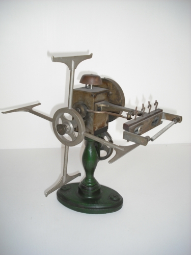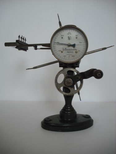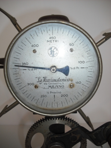 misurare la lunghezza di un provino di seta - Girando la manovella si avvolge il filo di seta nell'aspo vero e proprio e un conta metri segna tutto sul quadrante. Un campanellino suona a ogni quarto di provino e l'indicatore a frecca lo segna nel quadrante. Un provino deve essere lungo 450 metri.