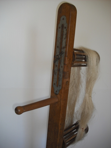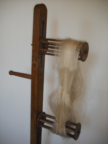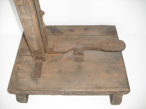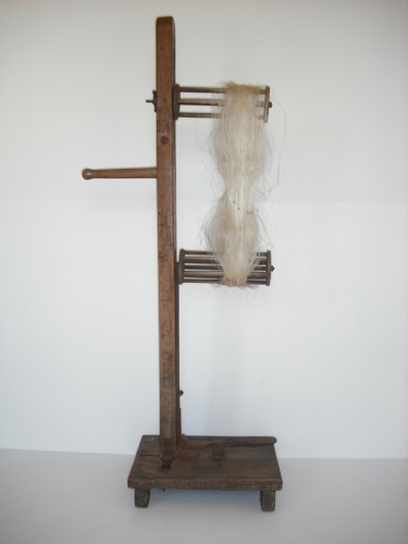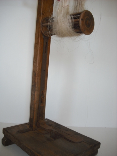 Reggere la matassa durante l'operazione di pulitura - Una leva a piede alza il cilindro inferiore consentendo il montaggio della matassa da esaminare e il successivo smontaggio.