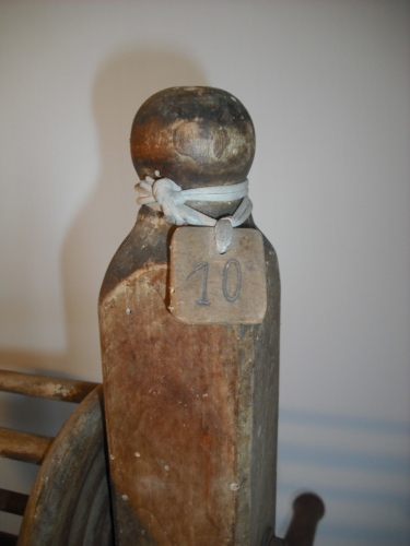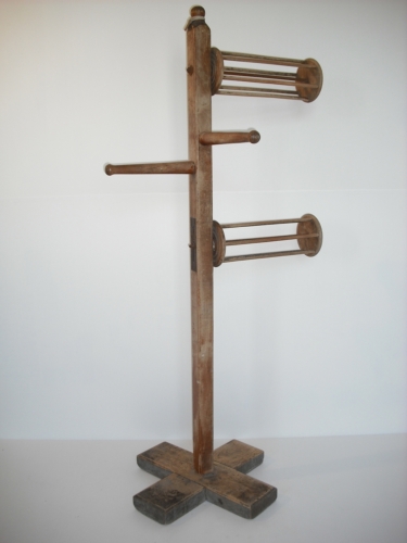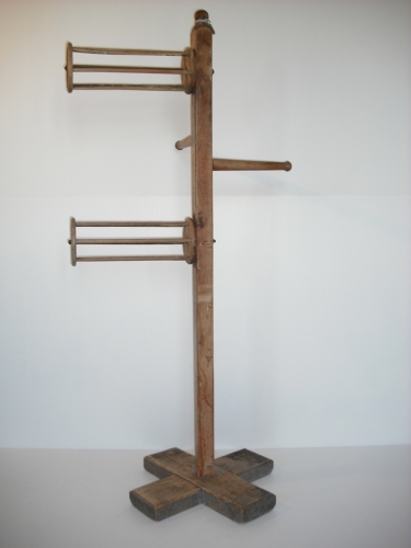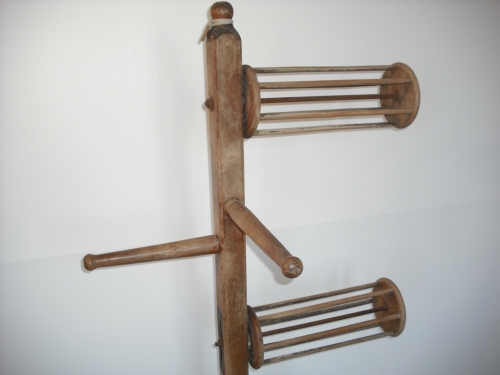 Reggere la matassa durante l'operazione di pulitura - Il cilindro inferiore si poteva muovere in alto e in basso per riuscire a infilare, e poi sfilare, la matassa.