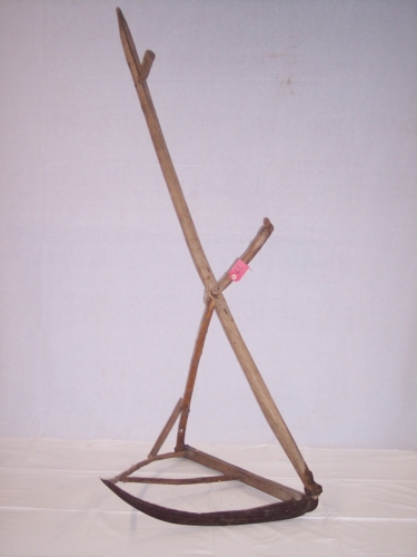 attrezzo composto da lama triangolare, incurvata al centro, terminante su un lato con una punta acuminata, e su quello opposto con una costola rialzata. Fissata al manico in legno con un'appendice ritorta ed inchiodata, alla quale si sovrappone un anello metallico. Il manico presenta due impugnature; quella posta a circa metà ha forma ad L, mentre quella superiore è dritta. Alle due estremità della lama sono inchiodate due aste di legno, in modo da formare con la lama un triangolo, esse sono fissate a loro volta con il manico tramite una terza asta verticale che parte dal vertice del triangolo, vicina a questa cè un'altra asta verticale più corta e più sottile, il tutto rafforzato da un'altra asta più sottile parallela alla lama e che divide in due il triangoloNotizie storico-critiche
