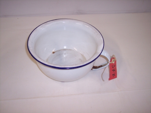 utensile in ferro smaltato di bianco di forma semicilindrica con bordo molto estroflesso di colore blu e una piccola ansa a nastro con i bordi rientranti che copre tutto loggettoNotizie storico-critiche
