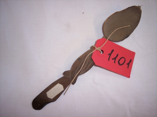 utensile in legno costituito da una parte superiore di forma ovoidale incavata e da una impugnatura rettangolare con base arrotondata, piatta con decorazioni intagliate a motivi vegetaliNotizie storico-critiche