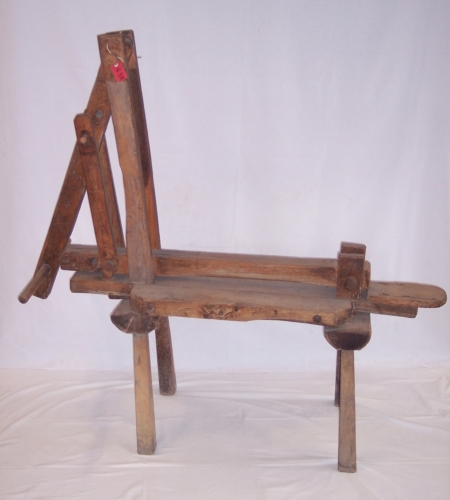 oggetto in legno costituito da una panca poggiante su due cavalletti con due gambe ciascuno; ad un'estremità della panca è posizionato il fulcro di una leva ad un braccio che viene azionato da un sistema di leve formato da due stanghe parallele verticali fissate con le estremità inferiori alla panca, mentre le estremità opposte costituiscono il fulcro di una seconda leva il cui braccio è collegato mediante due stanghe parallele al braccio della prima levaNotizie storico-critiche