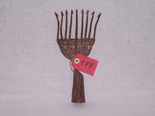 oggetto costituito da otto rebbi terminanti ad uncino uniti ad un cono cavo sul quale si innestava un lungo manico ligneoNotizie storico-critiche