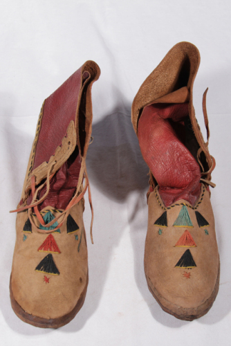 Stivaletti di pelle libici con decorazioni a triangolo di filo colorato, rosso, nero, verde e giallo. Compaiono alcune decorazioni a forma di stella verde e rossa. Lacci di cuoio.