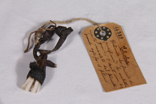 Descrizione sull'etichetta originaria: nr 16739. "Ehoha. Feticcio che finisce di purificare le malattie gravi. I denti sono del capretto immolato dal feticista, quando egli fa il feticcio".