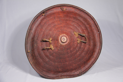 Lo scudo è realizzato con pelle di ippopotamo abbellita con tratti lineari impressi a secco sulla parte esterna. Sul lato interno si trova un'impugnatura in cuoio prevista per assicurare lo scudo all'avambraccio del portatore.