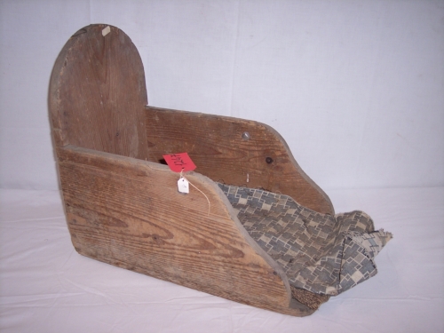 oggetto in legno levigato a forma di parallelepipedo cavo con testiera con il lato corto superiore semicircolare e con le facce laterali trapezoidali con il lato esterno obliquo ondulato; vicino alla parte ondulata ci sono due fori, probabilmente per inserirvi il manico in ferroNotizie storico-critiche