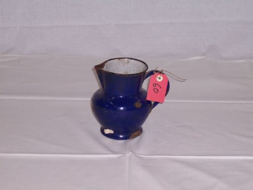 brocca con beccuccio, con collo largo, manico laterale a nastro ; interamente smaltata all'interno in colore bianco all'esterno blu.Notizie storico-critiche