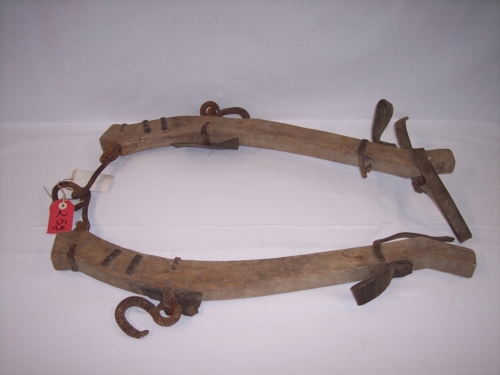 oggetto costituito da due aste di legno leggermente curve; con le estremità superiori unite tra loro mediante tondino di ferro a catena; con le estremità inferiori munite di due asole in cuoio e da una striscia di cuoio leggermente più in basso; a circa metà delle aste vi sono due ganci esterni, costituiti da un occhiello circolare e da un gancio a forma di SNotizie storico-critiche