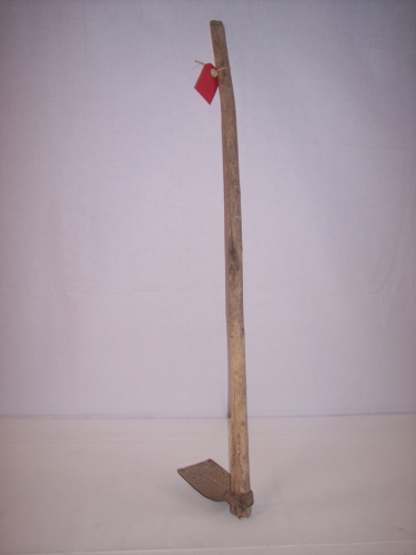 Oggetto costituito da una lama quadrata con un lato semicircolare vicino allanello che serviva per fissarla al manico perpendicolarmente e da un manico lungo in legno a sezione circolareNotizie storico-critiche