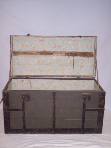 oggetto a forma di parallelepipedo cavo allinterno, con coperchio superiore sempre incavato a forma di parallelepipedo; i bordi sono circondati da lamine metalliche; e due fasce metalliche circondano tutto il baule vicino ai bordi. Al centro della parete longitudinale anteriore cè una serratura interna, sulle pareti corte laterali sono presenti due manici ad anelloNotizie storico-critiche