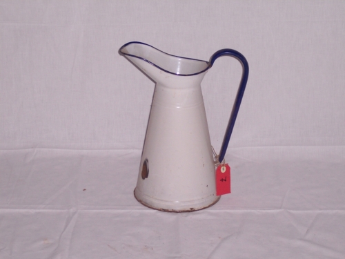 brocca in ferro smaltata di colore bianco di forma troncoconica svasata verso il basso con collo sporgente di forma ovoidale con beccuccio alto rivolto verso lesterno e orlo leggermente rigonfio di colore blu, manico di colore blu molto lungo che parte dallorlo della parte posteriore del collo e arriva fino ad un quarto di distanza dalla base della broccaNotizie storico-critiche