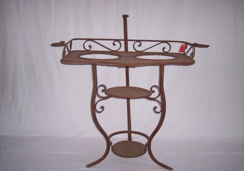 utensile costituto da uno scheletro in ferro con tre gambe semicurve che sorreggono tre ripiani di grandezza decrescente: un piano mistilineo con due fori simmetrici al centro, delimitato su tre lati da balaustra in ferro battuto ornata a doppio ricciolo, con bordo rialzato e le estremità sporgenti a forma di ricciolo; il secondo piano a forma di disco di dimensioni più piccole con bordo rialzato, è unito alle gambe mediante mensole che fanno uscire alle estremità un doppio ricciolo; il terzo piano sempre circolare, di dimensioni ancora più piccole del precedente che è unito alle gambe da balaustra semi circolareNotizie storico-critiche
