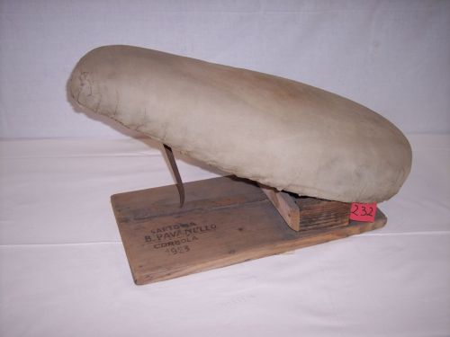 tavola di legno sagomata a mezza luna ricoperta da un'imbottitura costituita da stracci pressati racchiusi da un telo fissato alla tavola mediante spago e chiodi. La mezzaluna è incernierata ad un piccolo cassetto, il quale a sua volta è fissato tramite chiodi ad una tavola di legno. Su quest'ultima longitudinalmente nella mezzeria è posta una lamina metallica con dei fori sui quali si infila un perno fissato all'estremità opposta della mezzaluna.Notizie storico-critiche