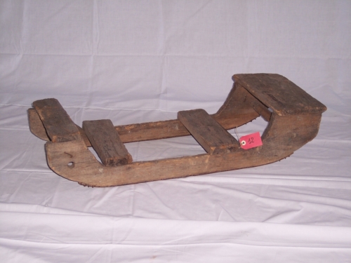 oggetto a forma di parallelepipedo cavo, in legno, con la parte anteriore e la parte posteriore costituita da tavole di legno di forma rettangolare (i sedili) collocate orizzontalmente sopra le estremità soprelevate di due pattini paralleli, rettangolari, poggianti sul lato lungo; sulla parte centrale dei pattini sono inchiodate trasversalmente due tavole rettangolari piane (fungenti da poggiapiedi)Notizie storico-critiche