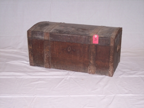 oggetto a forma di parallelepipedo cavo allinterno, con coperchio superiore sempre incavato a forma di parallelepipedo con i lati corti superiori semicircolari; i bordi sono circondati da lamine metalliche; e due fasce metalliche circondano tutto il baule vicino ai bordi. Al centro della parete longitudinale anteriore cè una serratura interna, sulle pareti corte laterali sono presenti due manici ad anelloNotizie storico-critiche