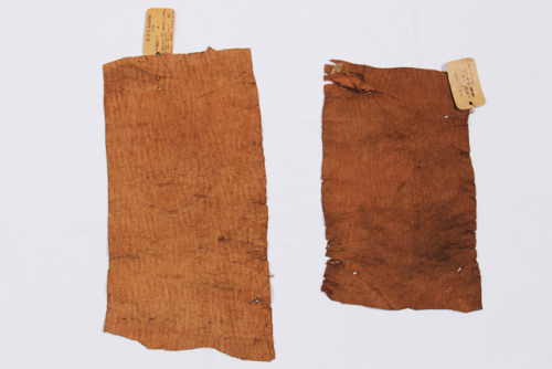 Archivio St. Petrus Claver Sodalität Triest (Sodalizio di San Pietro Claver per le Missioni Africane), nr.2001. Anno 1907. Zambesi. "Tela di scorza d'albero (Lubunga) cosiddetto. Gli alberi che la danno si chiamano Nituba (o Mituba). Tutte le donne e fanciulle cattoliche portano questa tela. Si fa battendo la scorza dopo averla bagnata, e anche accendendovi sotto del fuoco per levare tutto il duro".