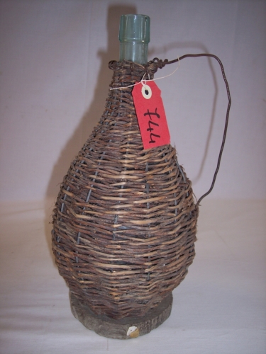 oggetto costituito da una intelaiatura in filo di ferro a forma di tronco di cono rivestita di vimini intrecciati, con un corto collo, svasata verso il basso, che si restringe alla base fatta da un disco in legno, manico sporgente ad arco in filo di ferro e da una bottiglia di vetroNotizie storico-critiche