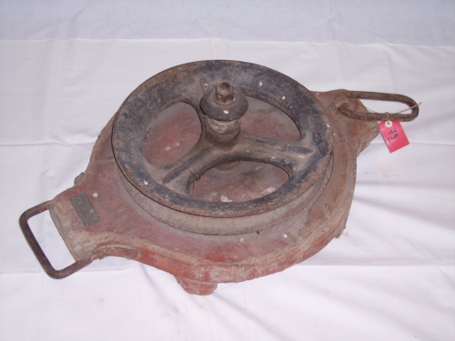 oggetto costituito da una base lignea circolare, con due propaggini diametralmente opposte sulle quali sono ancorati due anelli; sulla base è incernierata una puleggia metallica di forma circolare con tre raggi grossi uniti ad un bordo ben evidenziato e al centro una parte circolare rialzataNotizie storico-critiche