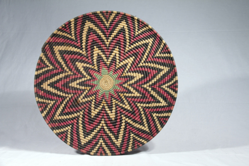 Piatto che ha molti elementi decorativi comuni con i caratteristici contenitori-cestini zulu. Sono intrecciati a mano da erba e foglie di palma (Hyphaene coriacea. In passato venivano usati colori naturali ricavati da corteccia, bacche,foglie, terra, radici, sterco).