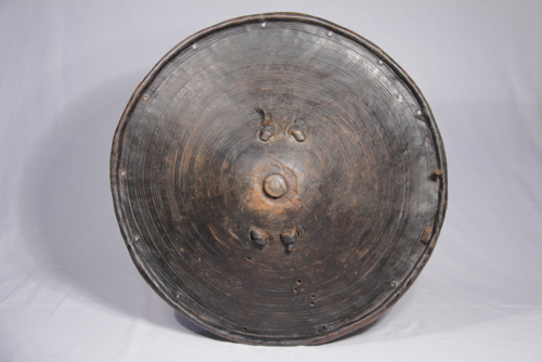 Lo scudo è realizzato con pelle di ippopotamo abbellita con tratti lineari impressi a secco sulla parte esterna. Sul lato interno si trova un'impugnatura in cuoio prevista per assicurare lo scudo all'avambraccio del portatore.