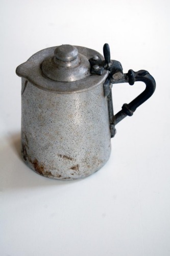 Recipiente di latta di forma cilindrica rastremata, dotato di beccuccio sul bordo superiore; lateralmente provvisto di manico ad occhiello, di plastica nera e latta; il manico è solidale con una barretta di latta a forma di T, fissata alla superficie del recipiente mediante tre borchie (una inferiore e due superiori); il recipiente è provvisto infine di un coperchio circolare dotato di beccuccio e modanatura centrale rialzata, che ne costituisce limpugnatura; il coperchio è fissato al manico del recipiente mediante un gancio dotato di un perno mobile (spezzato) e di una levetta verticale che serve per sollevare il coperchio.Notizie storico-critiche