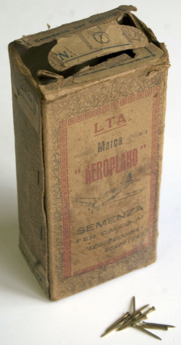contenitore di cartone a base rettangolare; contiene numerose semenze in acciaio, ovvero chiodini utilizzati nella produzione di calzature, in genere per fissare la tomaia o il tacco alla suola