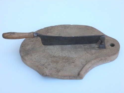 Tagliere in legno di gelso a forma ovale, su un lato il bordo è scanalato a formare unapertura a forma di becco. la parte superiore del tagliere è forata per poter essere appesa. Al tagliere è fissato in maniera stabile un grosso coltello con manico in legno.Notizie storico-critiche