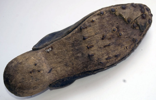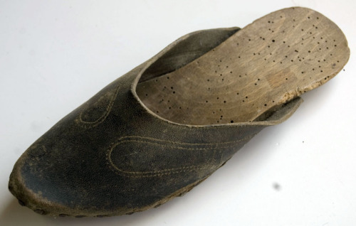 calzatura del piede sinistro con suola in legno e tomaia in cuoio, utilizzata da uomini e donne in casa e all'aperto