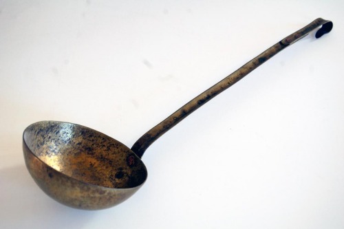 Utensile in ottone composto da un manico concavo, terminante ad uncino ad unestremità, e da una concavità di forma circolare. Il manico è fissato alla concavità tramite due borchie, una in rame e una in ferro; lestremità uncinata è fissata al resto del manico con 2 borchie in rame.Notizie storico-critiche