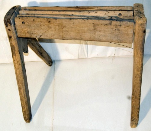 gramola a tre fessure su cavalletto a quattro gambe: strumento utilizzato per la gramolatura della canapa, cioè per liberare il tiglio dalle parti legnose delle piante. I tre spigoli della leva si incastrano in mezzo ai quattro spigoli fissi del cavalletto.