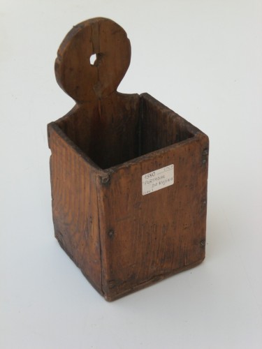 recipiente di forma quadrangolare formato da quattro tavolette in legno, tre delle quali uguali. La quarta, nella parte posteriore, sovrasta le altre ed è sagomata in forma rotonda con al centro un foro per appendere il manufatto. LE quattro pareti sono assemblate con chiodi fatti a mano.Notizie storico-critiche