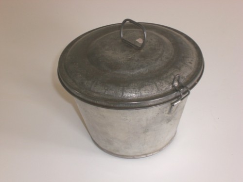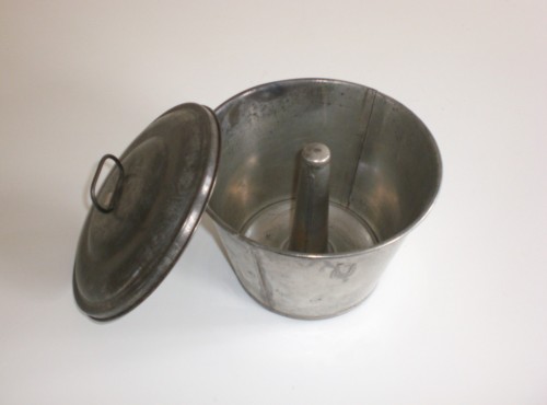 Recipiente in metallo a forma di tronco di cono poco svasato. Presenta un coperchio con anello sulla sommità per poterlo afferrare con facilità. Il coperchio viene tenuto annesso allo stampo tramite un gancio metallico applicato sul bordo dello stampo.Notizie storico-critiche