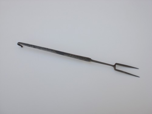 Grande forchetta in metallo a due rebbi con un lungo manico rigirato verso la fine per poter essere appeso.Notizie storico-critiche