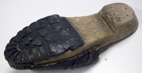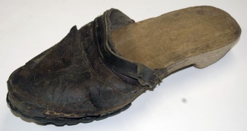 calzatura del piede sinistro con suola in legno e tomaia in cuoio, utilizzate da uomini e donne in casa e all'aperto