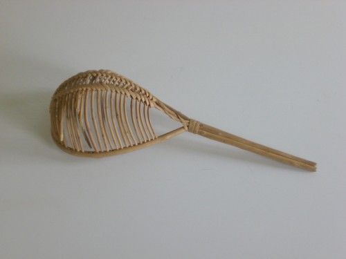Utensile in vimini di colore chiaro intrecciato a meno e di forma ovale con manico anchesso in vimini.Notizie storico-critiche